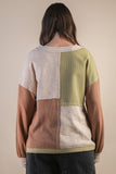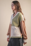 Oversized Color Block Casual Knit Top Intended oversized fit. Great quality. - Oversized Color Block Casual Knit Top - V-Neck - Drop Shoulder - Long Sleeve - Raw Edge Detail (Model height: 5"10", wearing a Small) SELF:74%POLY 26%COTTON